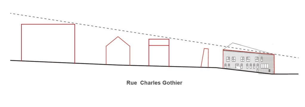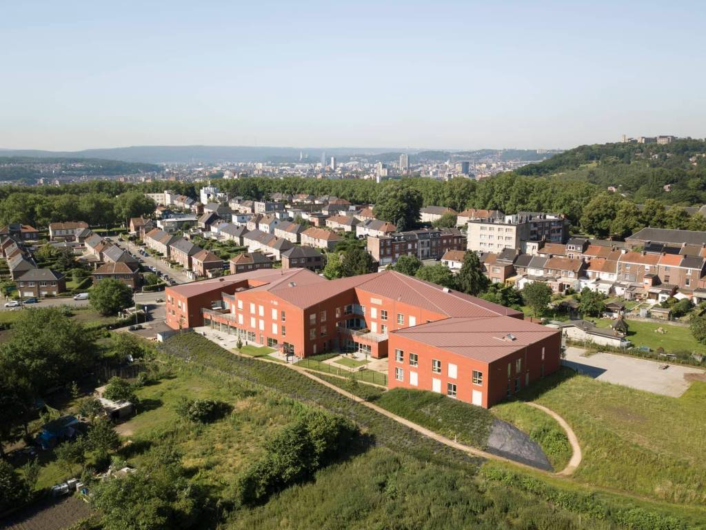 Implanté sur une parcelle longue et étroite, le projet s’inscrit dans la topographie pour développer cinq niveaux, dont trois en contact direct avec le sol. Les volumes se fragmentent en gabarits de deux à trois niveaux grâce à un jeu de toitures inclinées en zinc, assurant une insertion urbaine mesurée dans le quartier du Thier à Liège.